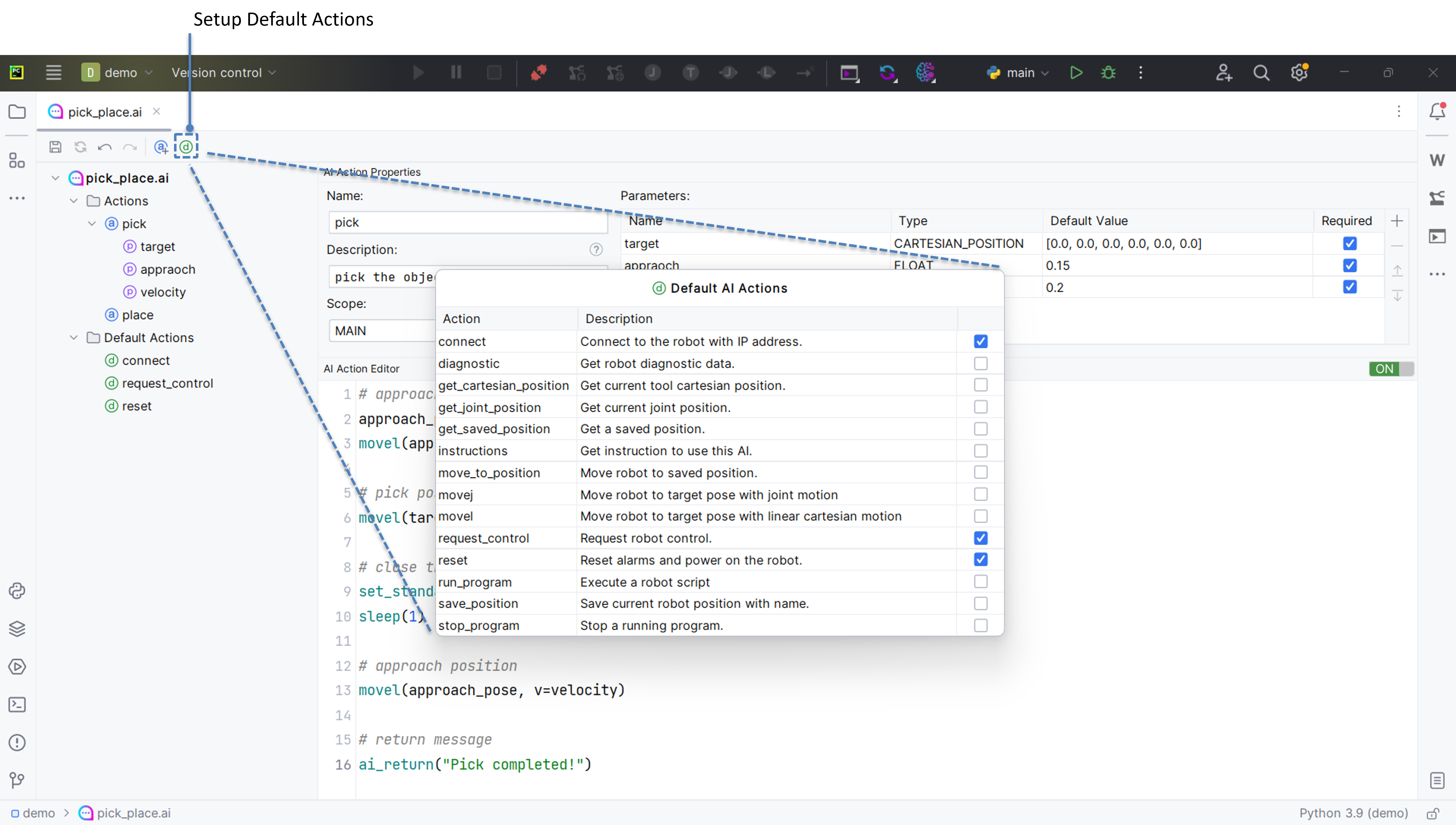 On the top bar, click on ![](https://175138337-files.gitbook.io/~/files/v0/b/gitbook-x-prod.appspot.com/o/spaces%2Fvxlh3prlGsBGF30oqbYW%2Fuploads%2FNn1V88nXlshsE0Mg8Lyn%2Fd.png?alt=media\&token=c018f49e-4d3a-4e29-a107-9ca2fdfe3bb2) **Default Actions** to setup which default action you want to include in your project. Default Actions are common pre-defined actions such as *"Save robot position"*, *"Turn on the robot"*, *"Move to position"* that can be added to your project. You don't have to provide an implementation for those actions.