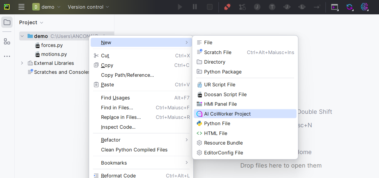 To create a new CoWorker Project, open [Robpod Studio](https://docs.robpod.cloud/get-started/introduction), then **Right click on the project folder -> New ->** ![](https://175138337-files.gitbook.io/~/files/v0/b/gitbook-x-prod.appspot.com/o/spaces%2Fvxlh3prlGsBGF30oqbYW%2Fuploads%2F2ZUOXGEw78DkDuGucIlg%2Fcoworker_file.png?alt=media\&token=ea2f36f1-b092-414e-a45e-48bd6db32585) **AI CoWorker Project**. Choose a name for the project and then press ↵ **Enter**. The Project Editor will open.