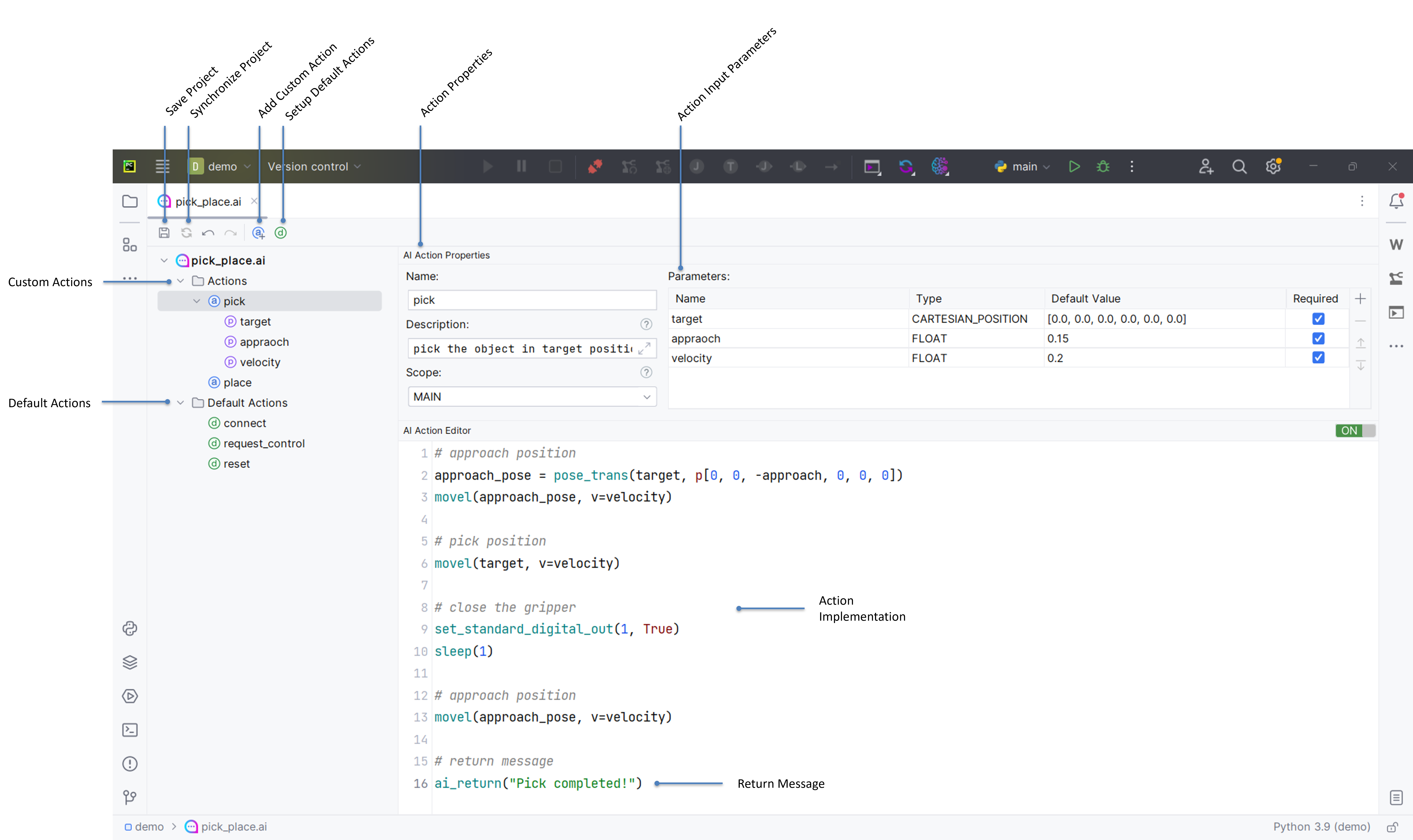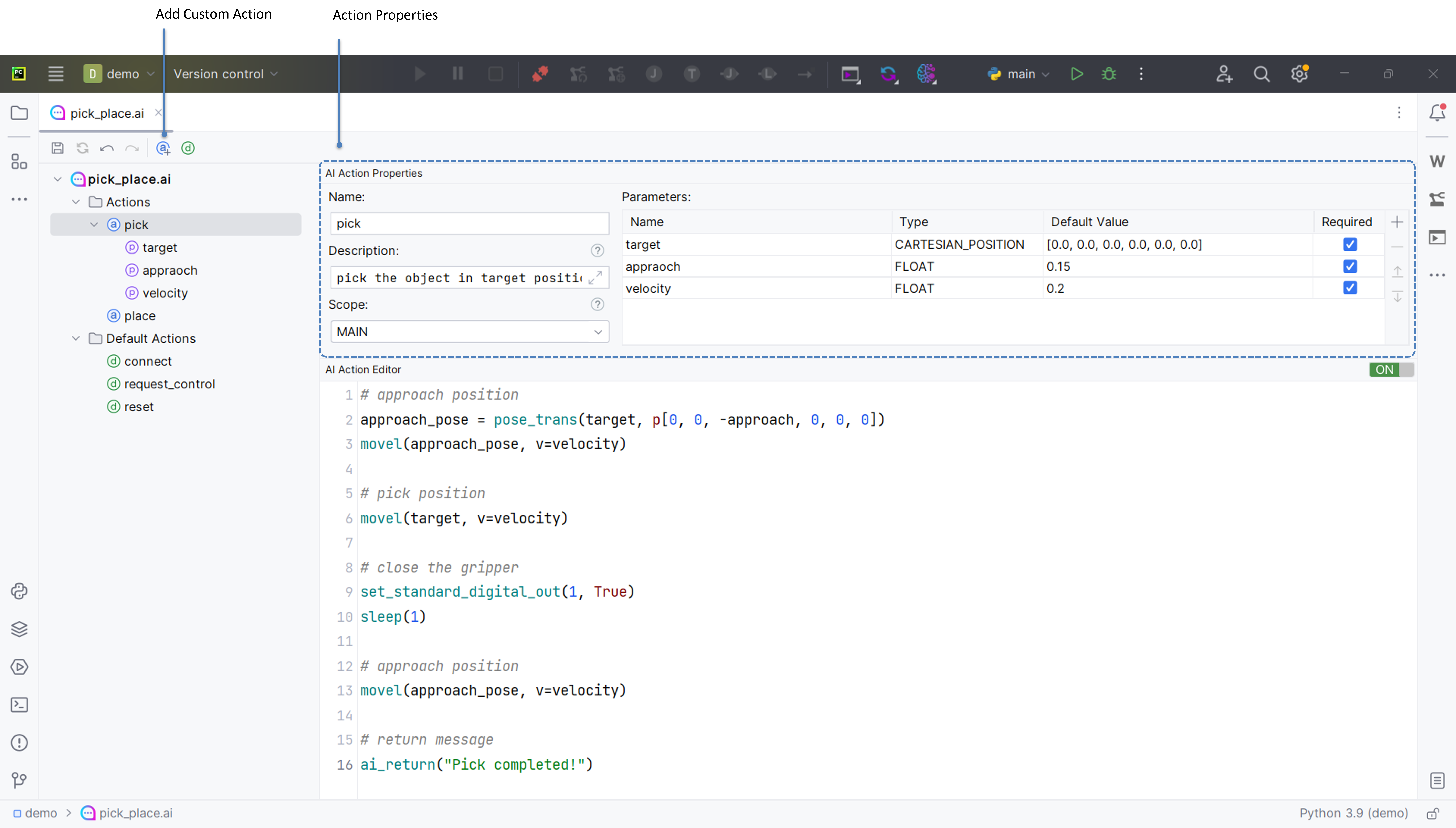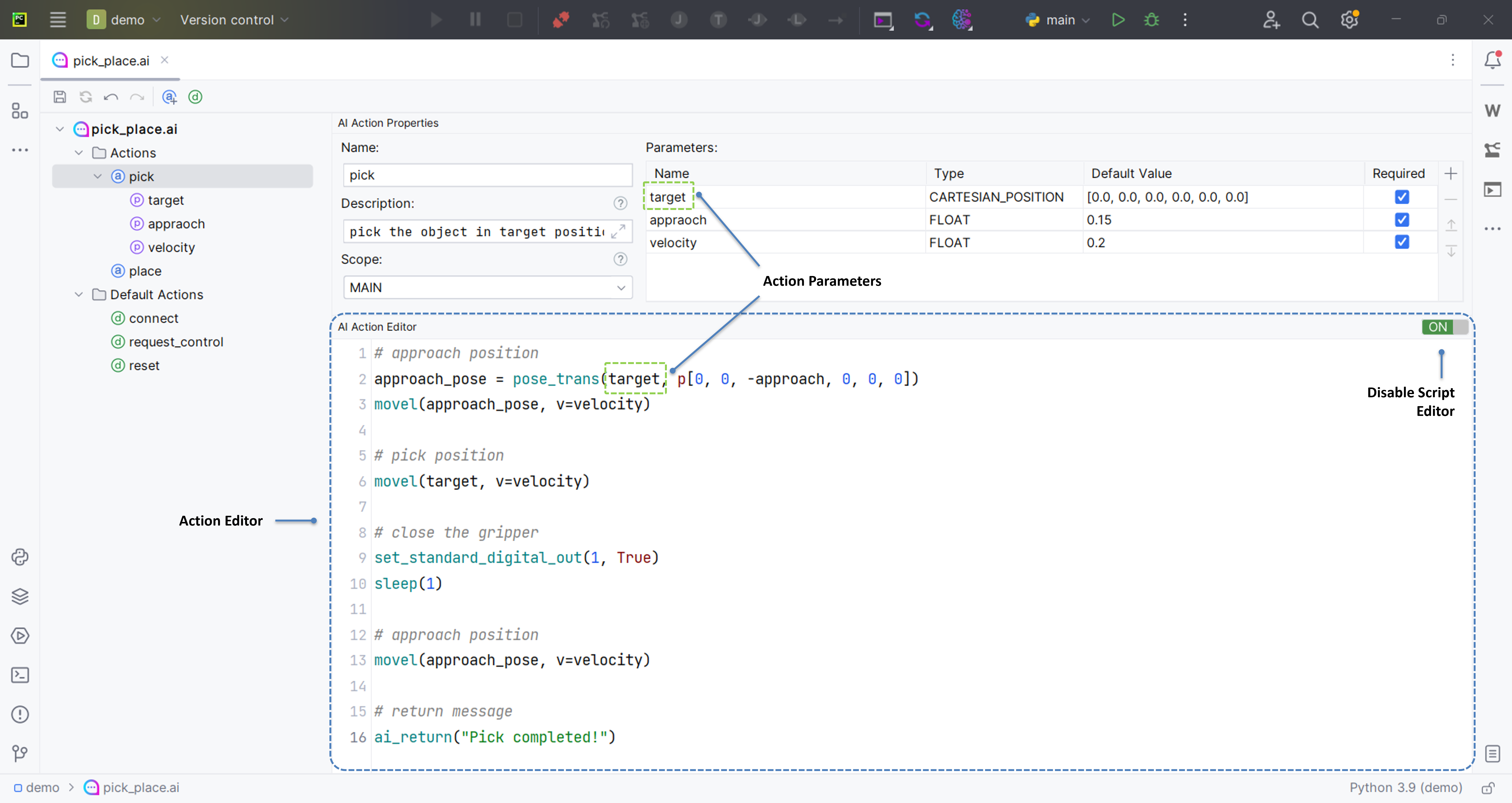 When the Script Editor is disabled, the name of the action must match exactly with the name of the function defined inside the robot program. i.e. if the action name is **pick**, then the action implementation must be defined inside the robot program using a function named **pick()**.&#x20;