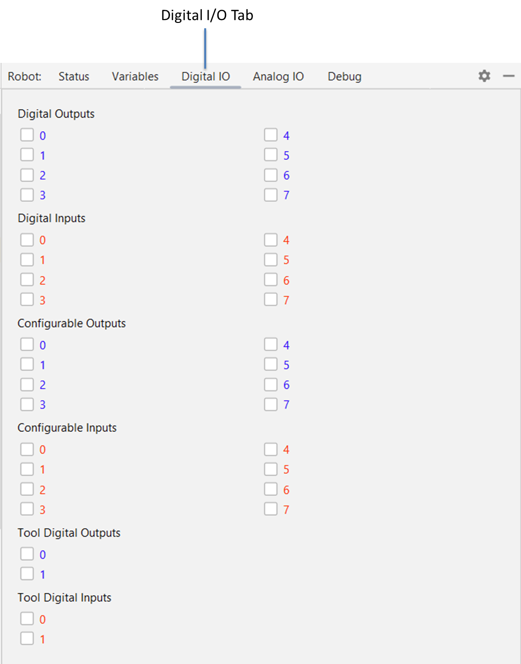 **Digital I/O Tab** will automatically adapt to the conncted robot to display the correct eletrical interface. In the following example eletrical interface for Universal Robots is displayed.