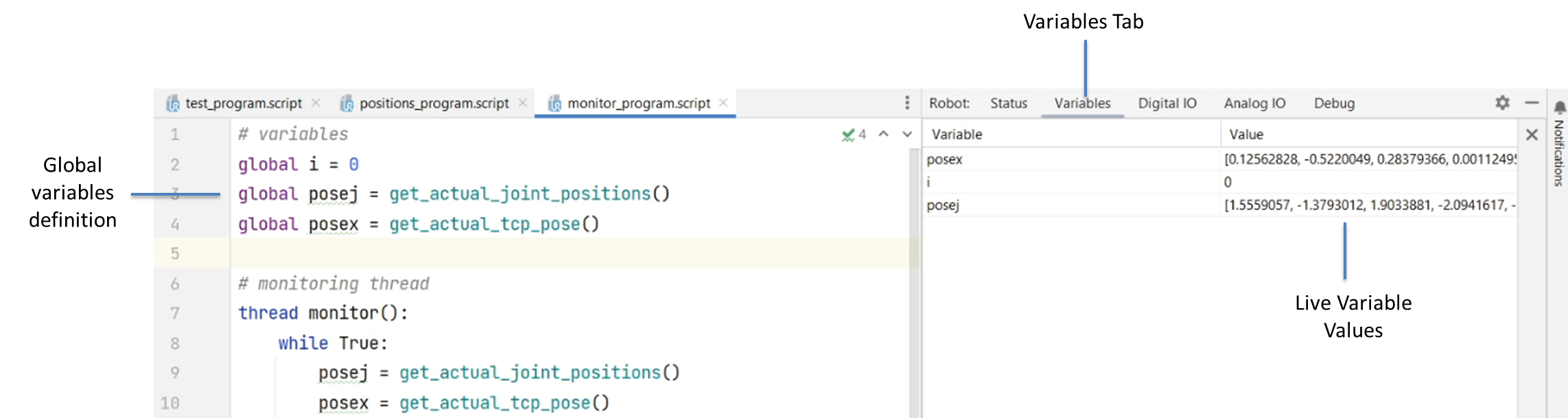 Remember to define a variable as **global** if you want to monitor it in the **Variables** tab.