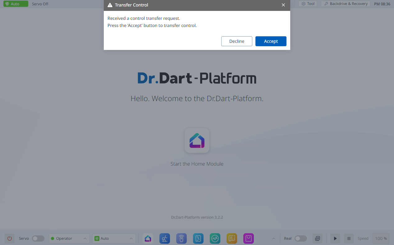 Doosan Robotics cobots require to obtain an operational grant before controlling the robot.